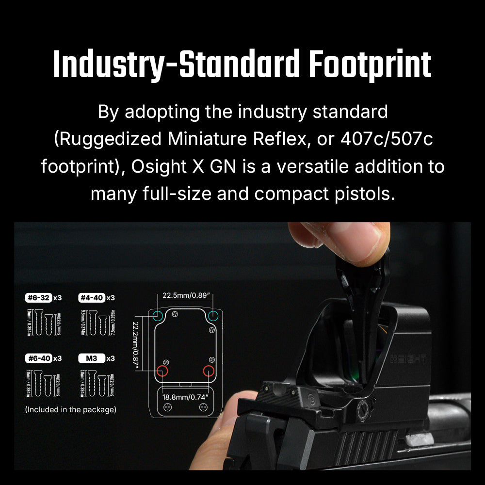 - Most Common Footprint: Using the de facto industry standard (Ruggedized Miniature Reflex, or 407c/507c footprint), Osight X GN fits many full-size and compact pistols. Osight Picatinny mounts add even more versatility with both high and low options for most rifle setups.